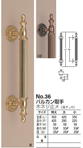 用途:可愛い 取っ手として 使えます。 商品名:ドア用取っ手 真ちゅう製 バルカン取手 大 420サイズ 型番:No.36 色:金色とGBブラウン色です。 サイズ: 〓L長さ420ミリ、〓高さ59ミリ、〓丸径 25ミリ。 材質:真鍮製 です。 特徴:とても廉価です。 付属品:ありません。