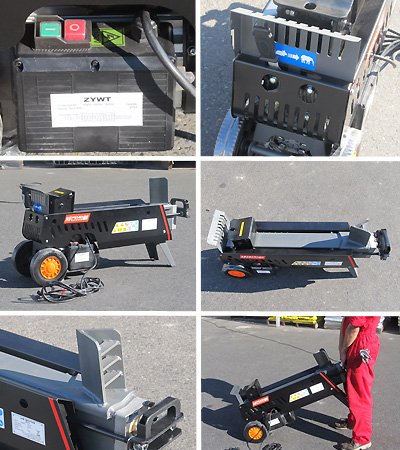 - 従来の7トンタイプは緑色の電源ボタンを押したままプッシュハンドルを操作するので両手が塞がれていましたが、今回の新型は緑色の電源ボタンを押すと電源が入るのでプッシュハンドル操作のみなので片手で楽に薪を割ることができます!!