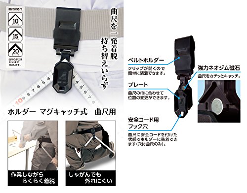 ●曲尺を一発着脱可能な為、持ち替え不要です。●ネジオム磁石でカチッとキャッチします。●しゃふがんでも曲尺が外れにくいです。●曲尺の幅10mm、15mm、20mmに対応しています。●曲尺に安全コードを付けた状態でホルダーに装着できます。(穴付曲尺のみ。)●注意1:本来の用途以外に使用しないで下さい。●注意2:ご使用の際は使用上の注意をよく読み、安全にご使用下さい。●内容量:1個●材質:本体:ABS樹脂 ピン:ステンレス 磁石:ネオジム ネジ:鉄●用途:曲尺の携帯、落下、紛失防止に●対応曲尺幅:10、15、20mm●対応曲尺厚:2mm厚まで●取付可能ベルトサイズ幅:50mm以内●取付可能厚さ:2.5~5mm以内●仕様:曲尺を外し、そのまま使用可能●仕様2:着脱が簡単なマグネット式●仕様3:しやがんでも曲尺が外れにくい●仕様4:曲尺に安全コードを付けたままの使用可能(穴付曲尺のみ)