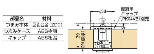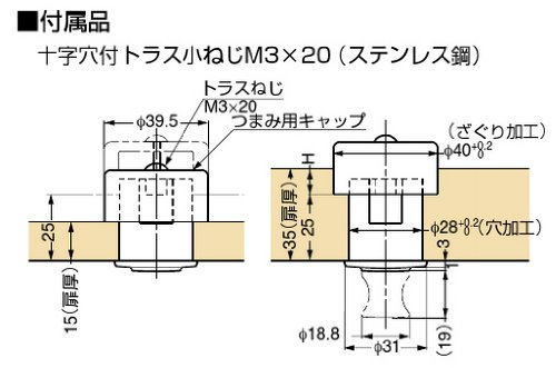 - さぐり深さH:扉厚15~25:H=0(φ28貫通穴)、扉厚26~35:H=扉厚-25(扉裏面)