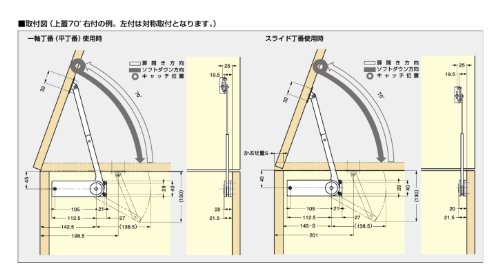 ●【用途】家具などの組立・補修等。【機能・特徴】トイボックス、寝具収納ケースなどに最適です。扉が最大に開いた状態を保持するキャッチを組み込んでいます。吊元丁番は一軸丁番(平丁番)、またはスライド蝶番230-26/19Tが最適です。●付属品:取付座金・十字穴付バインドタッピンねじ(3.5×15)。●別売品:一軸丁番(平丁番)・推奨スライド丁番(230-26/19T)。【材質】主材料:ABS樹脂・鋼。【注意事項】扉1枚あたり、左用、右用が各1ケずつ必要です。扉を開くとき、開き角度70度以上に押し上げないで下さい。また、無理な力を加えての開閉動作はおやめ下さい。軸トルクは扉、ハンドルなどのトルクを合算してお求めください。