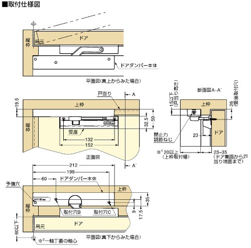 ●【用途】開いたドアを自動的に静かに閉める装置。【機能・特徴】取付位置のあわせが簡単で、施工性に優れています。ドアダンパー本体の厚さはわずか20mmのため、ドア枠にすっきりと納まります。ダンパー・引き込み機能の作動範囲が約15度と広く、従来の製品と比べ、早い位置からゆっくりと閉まり始めるため、丁番への負担も少なくなります。ドアクローザーとくらべ、ドアを軽く開けられます。開いたときにアームを引き込んだ状態にすると、ダンパー・引込機能をOFFにできます。●付属品:十字穴付皿タッピンねじ3.5×30・十字穴付バインドタッピンねじ4×16。【材質】本体:鋼・亜鉛合金(ZDC)。●受座:鋼・亜鉛合金(ZDC)。●カバー:ABS樹脂。