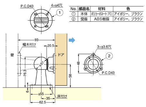 ●【用途】ドア・扉の保持。【機能・特徴】かがんで掛金の操作をする必要がなく、両手に荷物を持っていても使用できます。キャッチ部が球面(特許取得)のため、本体の床付け、幅木付けはもちろん、多少斜めに取り付けても扉を確実にホールドします。●付属品:十字穴付丸木ねじ3.5×22(本体用)・十字穴付丸木ねじ3.1×16(受座用)。【材質】本体:ポリカーボネイト(PC)。●受座:ABS樹脂。【注意事項】吸着力にはバラつきがあります。現品にてご確認ください。