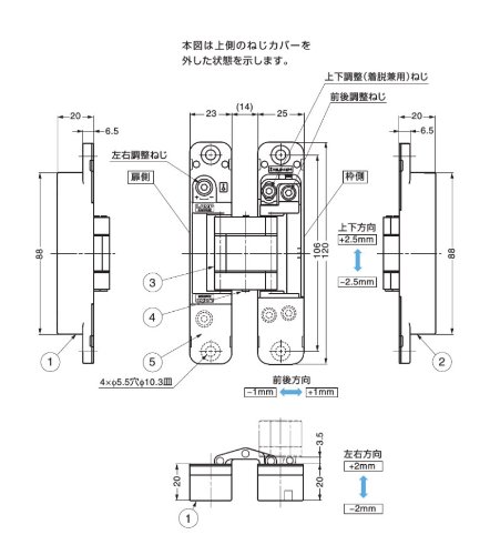 ●【用途】家具の開き扉用丁番。【機能・特徴】掘込深さが浅いため、扉や枠の掘込加工が簡単です。丁番は扉側と枠側に分割でき、扉を枠に仮止めする機能が付いています。扉の垂れさがりが少ない構造です。30万回の開閉試験をクリアしています。●扉質量:30kg以下/2ヶ・40kg以下/3ヶ。●仕上/カラー:サチライトクロムめっき/シャンパンゴールド。●適応ドアダンパー:ラプコンドアダンパーLDD-S型・LDD-V型。●付属品:十字穴付皿タッピンねじ5×20(4本/丁番1ヶ)・六角棒スパナ呼び3。【材質】本体・ベースフレーム・アーム:亜鉛合金(ZDC)。●回転軸:ステンレス鋼。●ねじカバー:ABS樹脂。【注意事項】使用するクローザーによっては、丁番が破損したり、動きがわるくなったり、扉が閉まりきらなかったりする場合があります。コンシールド・ドアクローザーと併用する場合、HES3D-160型を推奨します。