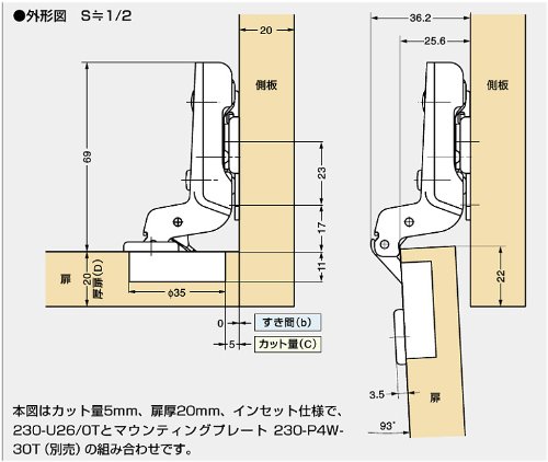 スガツネ工業 ランプ印 230シリーズ ワンタッチスライド丁番 230 プッシュオープンタイプ 230-U26/0T