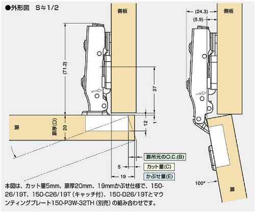 スガツネ工業 ランプ印 ワンタッチスライド丁番 150 ダンパー内臓タイプ 150-D26/19T