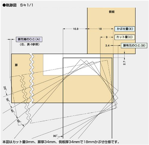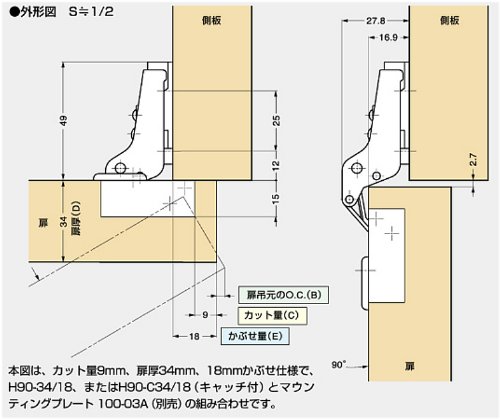 スガツネ工業 ランプ印 100シリーズ スライド丁番 H90 厚扉用 H90-34/18