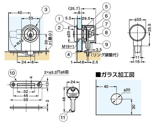 ●【用途】ショーケースなどの施錠。【機能・特徴】キーは、抜き差し方向性のないリバーシブルタイプで、解錠時(90度時計回りで解錠)にキーが抜けないつまみ兼用型です(施錠時にキーは抜けます)。ディンプルキー仕様で鍵違い数は最大100万通りです。RoHS指令に対応しています。●鍵:同番。●付属品:十字穴付皿木ねじ2.7×13(ステンレス鋼)。【材質】本体・化粧リング・キー:黄銅(真鍮)。●カバー・リング:ポリプロピレン(PP)。●正面プレート・ロックプレート・受座:ステンレス鋼(SUS304)・六角ナット・ワッシャ:鋼。【注意事項】ロックプレートの向きは変更できません。ご使用の際、キーに大きな負荷が掛かると変形や作動に支障が出る場合がありますのでご注意ください。