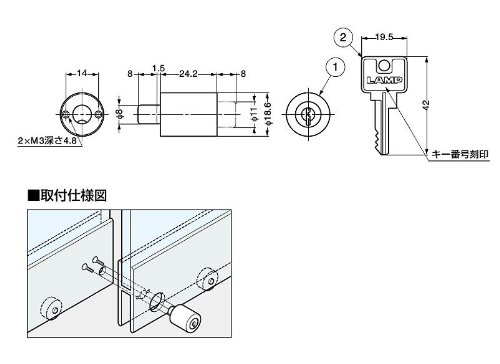 - 施錠方法 : キー不要・シリンダー径 : φ18.6mm・取付はかま厚 : 24mm・鍵違い数 : 24通り