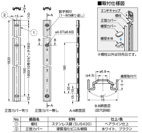 スガツネ工業 ランプ印 ステンレス鋼製棚柱 SPW型 正面カバー SPW-CV1820-WT 白