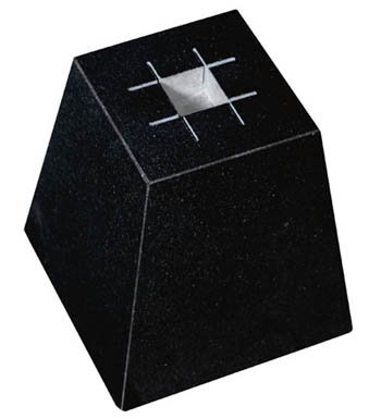 住宅の基礎・柱の下の束石・沓石。上面180mm×下面240×高さ200mm。50×50mm(深さ40mm)のホゾ穴。中心に20mm丸穴貫通