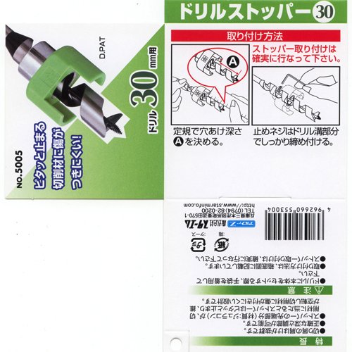 ●【用途】穴あけ深さを一定にできるドリル30mm用ストッパー。【特徴・機能】木工用・鉄工用・コンクリート用ドリルに取付け可能です。止めたいところでピタリと止まります。樹脂製なので被削材に傷がつきにくくなっています。【注意事項】振動ドリルに取付けて使用しないで下さい。