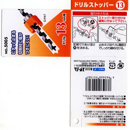 ●【用途】穴あけ深さを一定にできるドリル13mm用ストッパー。【特徴・機能】木工用・鉄工用・コンクリート用ドリルに取付け可能です。止めたいところでピタリと止まります。樹脂製なので被削材に傷がつきにくくなっています。【注意事項】振動ドリルに取付けて使用しないで下さい。