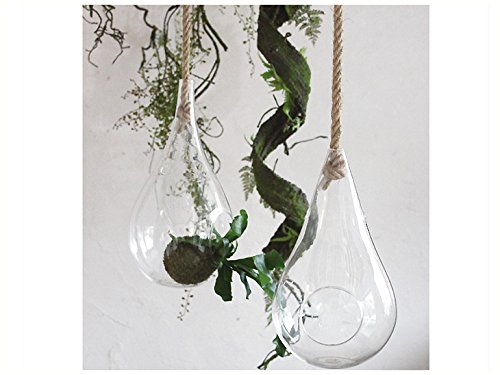 吊るして飾るガラスの花瓶 エアプランツやアイビーなどのツタ植物と相性の良い大ぶりのドロップ型のガラスベース。リビングや窓辺など、ちょっとした梁の部分にラフにくくって楽しむことができます。