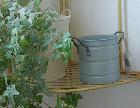 - ジャンクガーデンには定番のブリキ製のラウンドポット。