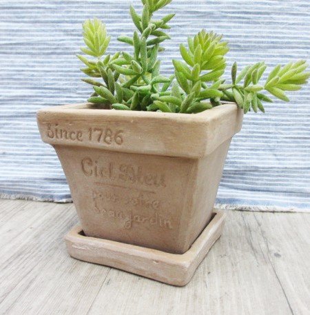 シンプルで使いやすいプランターです。 正面には細かいフランス語が彫られていて、光の加減で表情が違って見えるのも素敵です♪ 流行りの多肉植物などにもぴったりです♪ シリーズで並べるのもおしゃれです!! ※1・4枚目画像はご使用イメージです。小物は付きません。