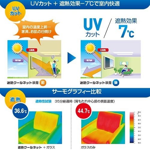 遮熱クールネットは、ポリエステルメッシュ生地にステンレスをコーティングした遮熱効果の高い省エネ窓、アルミサッシ貼り用ネットです