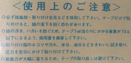 - ・必ず接着剤・取付金具などを併用して下さい。テープだけで貼り付けると、鏡の落下を招く恐れがあります。