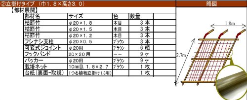 ●【用途】ゴーヤ、キュウリ、アサガオなどの栽培。【機能・特徴】簡単に組立設置ができ、移動、収納も連結ジョイントを外さず、手軽にできます。可変式ジョイントで奥行・高さ調整可能です。両端水密内キャップ式で丈夫で長持ちします。緑のカーテンで夏を涼しく、節電にも貢献します。【セット内容】縦支柱(径20X1.8mX3本・径20X0.9mX3本・径20X0.4mX3本)。横支柱(径20X1.8mX3本)・可変ジョイント(径20用X6組)。フックバンド(径20X20用X9)・栽培ネット(10cm-1.【注意事項】組立サイズは、設置角度、ジョイントの角度により多少異なります。