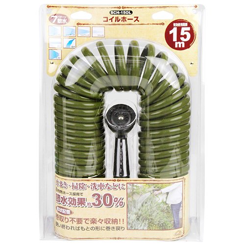【特長】【仕様】●ホース内径:8mm。●ホース外径:13mm。●有効使用範囲:15m。●散水ノズル:7パターン。●耐水圧:0.6MPa(7kgf/cm)。●耐熱温度:0〜40度。●色:オリーブ。【材質】●ホース部:軟質塩化ビニール。●ノズル・ アタッチメント部:ABS樹脂。サイズ:15mカラー:オリーブ