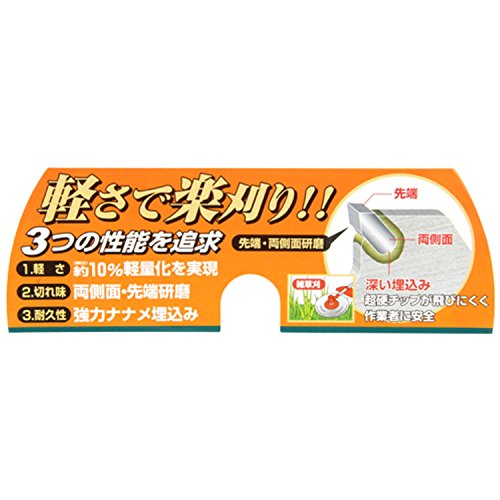 ●【用途】草刈り。【機能・特徴】強力斜め埋め込みチップで耐久性抜群です。両側面・先端研磨なので、切れ味抜群です。雑草刈に最適です。メーカー従来品に比べ約10%軽量化しました。JIS規格品です。