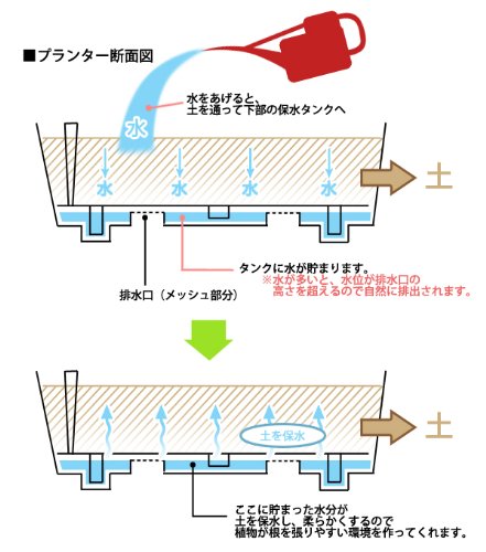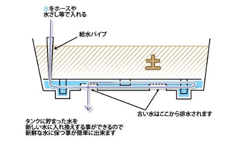 日頃の水やりや、自然に降り注いだ雨水が底部に溜まるので、定期的に給水パイプでリフレッシュしてあげると、より健全なコンディションに保つことが出来る。