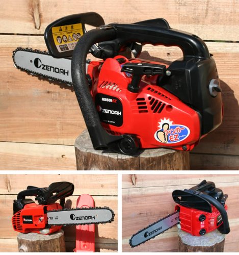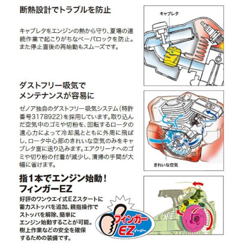 ゼノア(ZENOAH)のエンジンチェンソー G2501T-EZ フィンガーEZ スーパーこがるです。ハンドル3点防振、そして枝打ち作業など小型チェンソーを樹上で使用する場合の安全確保対策としてフィンガーEZを搭載、あらかじめ貯めておいたアシストスプリングの蓄力エネルギーを(指1本で)開放する方法でエンジンを始動できる画期的なトップハンドルソーです。