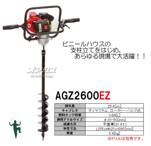ゼノア(Zenoah)のエンジンオーガーです。環境対応エンジン「ストラト・チャージド?・エンジン」を搭載、手軽に持ち運びができる軽量・コンパクトな穴掘り機です。ビニールハウスの支柱立てをはじめ、農業・林業・電気工事、水道工事など様々なシーンでも大活躍! 手作業では大変な杭・柱・支柱の埋設などあらゆる穴掘り作業に対応します。オプションドリルも充実、用途に応じて最適なものをお選び下さい。