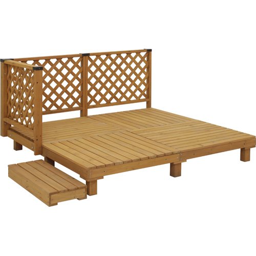 デッキ作りに必要なパーツがセットになっています。パーツを組んでお手軽にデッキが完成!デッキの上でくつろぎの休日を♪なんてのはいかがでしょう。デッキの床板は十分な厚みがあり、アクリル樹脂塗装を施しているため、紫外線や風からの耐候性に優れています。ラティスの手すりには、スチール製のカバーがついているため、ぐらつきを防ぎ、強度を高めています。ステップ付きなので昇降りが簡単に行なえます。オプションパーツを使用すれば、ご自宅に合わせたオリジナルのデッキを作ることが可能です。 サイズ⇒幅 約187cm×奥行 約187cm×高さ 約95cm (地面~床までの高さ 約24cm)、重量⇒約 67kg、材質⇒天然木(アクリル樹脂塗装)、組立品