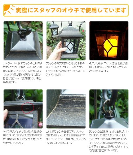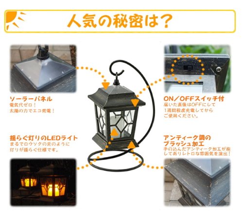 - ソーラーパネルはランタンの上にあります。ここに日光がたっぷり当たる場所に設置してください。