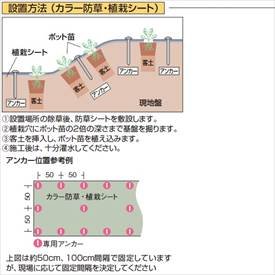 ● 防草・植栽シートは、雑草等の繁殖を抑制するものであり、完全防草ではありません。1カ所に雑草が発生すると、周囲に遮るものがないため、1つの株が大きく成長する傾向がありますので、定的なメンテナンスが必要です。