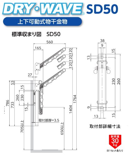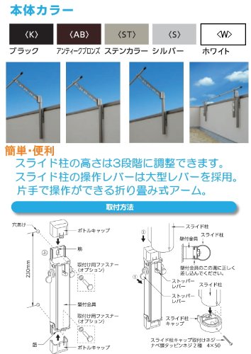 上下可動式物干しSDK50 アルミダイキャスト製物干し金物(1セット2本入) 材 質 アルミダイキャスト製 物干し 仕 様 アーム物干し使用時出寸法500mm 高さ調整120mmピッチ3段階 カラー ブラック・アンティクブロンズ・ステンカラー 特 徴 物干しアームは上45度、水平、下45度の3段階調整。 ポール高さは3段階調整可能。 アルミ製での3色からお選び頂けます。 価格は1セット2本入りの価格です。物干し竿、取付ビスなどはついていません。