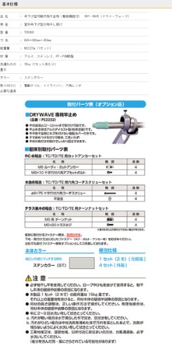 ベランダ、カーポートなどで使える吊下げ型物干し メーカー出荷時状態でお届けします。 躯体に取付けるファスナー類は別売りです。下地・取付方法に応じたファスナーをお求めください。 ・TC/TD用カットアンカーセット(RC造用) ・TC/TD用コーチスクリューセット(木造用) ・TC/TD用ターンナットセット(テラス垂木用) オプション ・DRYWAVE 専用竿止め