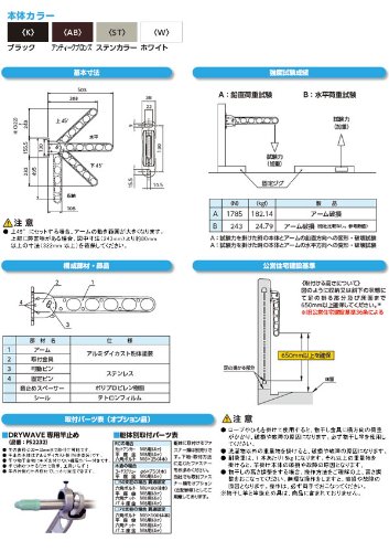 窓際に取り付けて使うことができる物干金物 メーカー出荷時状態でお届けします。 躯体に取付けるファスナー類は別売りです。下地・取付方法に応じたファスナーをお求めください。 ・SE・KA・KB用カットアンカーセット(RC造用) ・KA・KB・SD用六角コーチボルトセット ・KA・KB・SD用支柱用(□50mmまで)ボルトセット ・KA・KB・SD用支柱用(□70mmまで)ボルトセット オプション ・DRYWAVE 専用竿止め