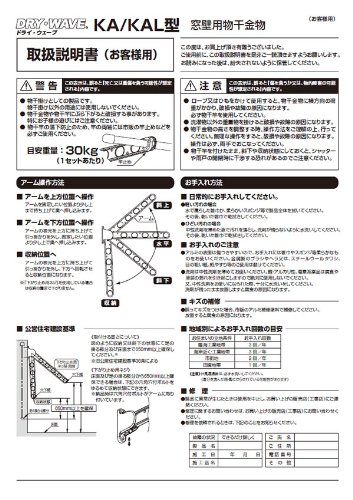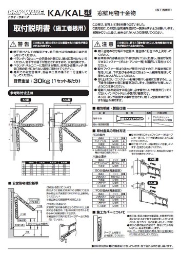 窓際に取り付けて使うことができる物干金物 メーカー出荷時状態でお届けします。 躯体に取付けるファスナー類は別売りです。下地・取付方法に応じたファスナーをお求めください。 ・KA65/75用カットアンカーセット(RC用) ・SE・KA65/75・KAL用コーチスクリューセット(木造用) ・KA・KB・SD用支柱用(□50mmまで)ボルトセット ・KA・KB・SD用支柱用(□70mmまで)ボルトセット オプション ・DRYWAVE 専用竿止め