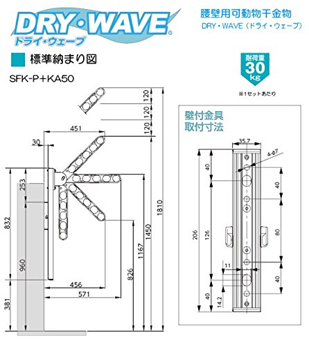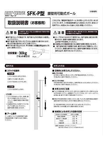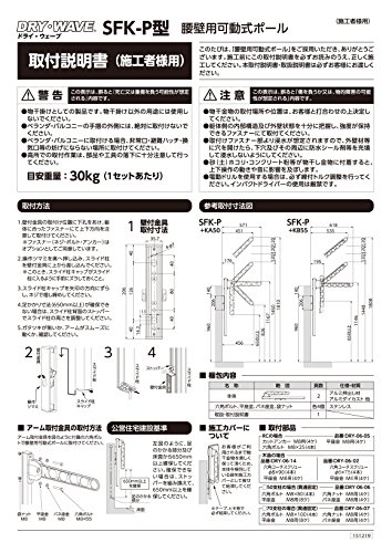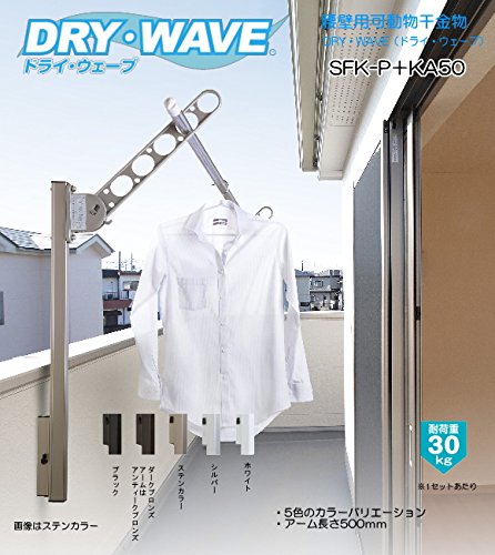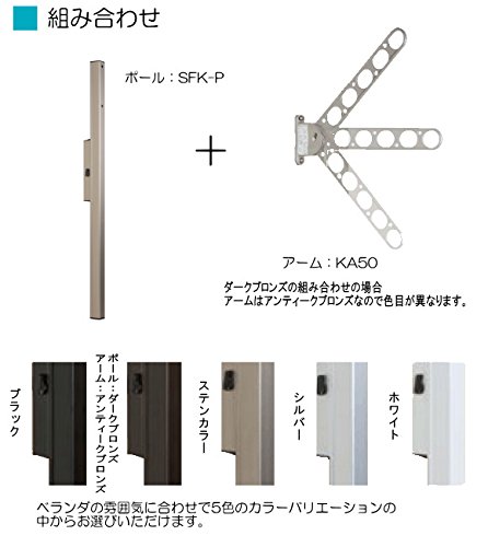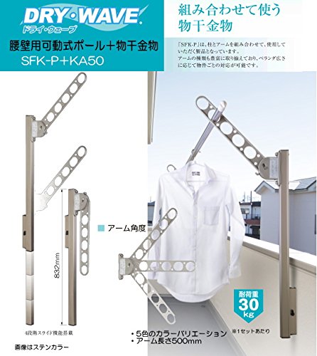 腰壁用可動式ポール+物干金物(DRY・WAVE) ドライ・ウェーブSFK-P+KA50 (1セット2本組) ポール(柱)とアームを組み合わせて使う物干金物です。 SFK-P(柱)は4段階の高さ調整が可能です。取付けやすく機能も豊富! アーム金物KA50は3段階角度調整と収納の4段階調整可能。 ベランダに物干し台を置くより有効にスペースを利用できます。アルミ製で腐食に強く、 カラーもブラック・ダークブロンズ・シルバー・ステンカラー・ホワイトの5色! 材質アーム:アルミダイキャスト製 スライド柱:アルミ押し出し材 キャップ類:ポリプロピレン樹脂 カラー/ブラック(K)・ダークブロンズ(BKC)・シルバー(S)・ステンカラー(ST)・ホワイト(W) ※ダークブロンズでの物干しアームはアンティークブロンズです。 サイズ/アーム長さ 500mm ポールは120mmで4段階スライド調整可能 耐荷重/1セット当たり:30kg ●アームは斜上・水平・斜下の3挽回と、収納です。 ●音止め部品により、強風時や操作時の不快な金属音を大幅軽減した設計 ●手すりやサッシなどに合わせて、5色のカラーバリエーションより選択できます。 ●価格は1セット2本入りの価格です。取付ビス、物干し竿などはついていません。