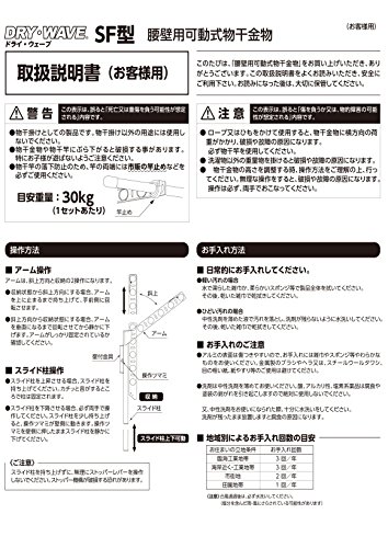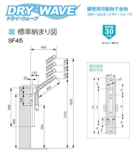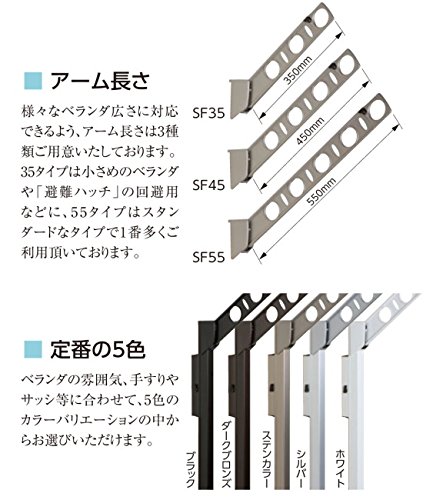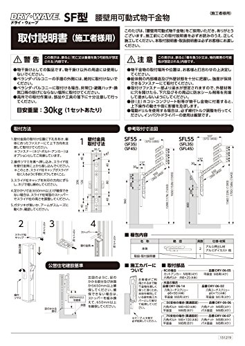 腰壁用可動式物干金物(DRY・WAVE) ドライ・ウェーブSF45 (1セット2本組) 上下スライド式 スリムで洗礼されたデザイン性と確かな品質。 スライド柱は4段階の高さ調整が可能です。取付けやすく機能も豊富! シンプルなフォルムの万能物干し。強度もつよく、重量は軽くできています。 ベランダに物干し台を置くより有効にスペースを利用できます。アルミ製で腐食に強く、カラーもブラック・ダークブロンズ・シルバー・ステンカラー・ホワイトの5色! 材質/アーム:アルミダイキャスト製 スライド柱:アルミ押し出し材 キャップ類:ポリプロピレン樹脂 カラー/ブラック(K)・ダークブロンズ(BKC)・シルバー(S)・ステンカラー(ST)・ホワイト(W) サイズ/アーム長さ 450mm ポールは120mmで4段階スライド調整可能 耐荷重/1セット当たり:30kg ●アームは斜上にと、垂直収納が可能です。 ●音止め部品により、強風時や操作時の不快な金属音を大幅軽減した設計 ●手すりやサッシなどに合わせて、5色のカラーバリエーションより選択できます。 ●価格は1セット2本入りの価格です。取付ビス、物干し竿などはついていません。