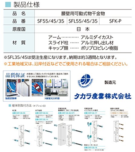 腰壁用可動式物干金物 タカラ産業(DRY・WAVE) ドライ・ウェーブSF45 ホワイト(W) (1セット2本いり) 上下スライド式 スリムで洗礼されたデザイン性と確かな品質。