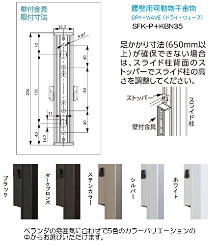 腰壁用可動式ポール+物干金物(DRY・WAVE) ドライ・ウェーブSFK-P+KBN35 (1セット2本組) ポール(柱)とアームを組み合わせて使う物干金物です。SFK-P(柱)は4段階の高さ調整が可能です。取付けやすく機能も豊富! アーム金物KBN35は2段階角度調整と垂直収納。ベランダに物干し台を置くより有効にスペースを利用できます。アルミ製で腐食に強く、 カラーもブラック(K)・ダークブロンズ(BKC)・シルバー(S)・ステンカラー(ST)・ホワイト(W)の5色! 材質/アーム:アルミダイキャスト製 スライド柱:アルミ押し出し材 キャップ類:ポリプロピレン樹脂 カラー/ブラック(K)・ダークブロンズ(BKC)・シルバー(S)・ステンカラー(ST)・ホワイト(W) サイズ/アーム長さ 350mm ポールは120mmで4段階スライド調整可能 耐荷重/1セット当たり:30kg ●アームは斜上にと、垂直収納が可能です。 ●音止め部品により、強風時や操作時の不快な金属音を大幅軽減した設計 ●手すりやサッシなどに合わせて、5色のカラーバリエーションより選択できます。 ●価格は1セット2本入りの価格です。取付ビス、物干し竿などはついていません。