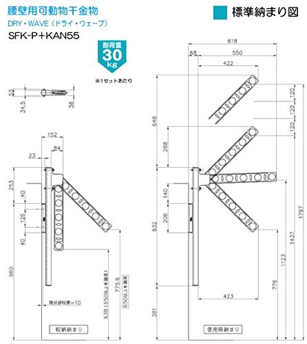 腰壁用可動式ポール+物干金物(DRY・WAVE) ドライ・ウェーブSFK-P+KAN55 (1セット2本組) ポール(柱)とアームを組み合わせて使う物干金物です。 SFK-P(柱)は4段階の高さ調整が可能です。取付けやすく機能も豊富! アーム金物KAN55は3段階角度調整と収納の4段階調整可能。 ベランダに物干し台を置くより有効にスペースを利用できます。アルミ製で腐食に強く、 カラーもブラック・ダークブロンズ・シルバー・ステンカラー・ホワイトの5色! 材質アーム:アルミダイキャスト製 スライド柱:アルミ押し出し材 キャップ類:ポリプロピレン樹脂 カラー/ブラック(K)・ダークブロンズ(BKC)・シルバー(S)・ステンカラー(ST)・ホワイト(W) サイズ/アーム長さ 550mm ポールは120mmで4段階スライド調整可能 耐荷重/1セット当たり:30kg ●アームは斜上・水平・斜下の3挽回と、収納です。 ●音止め部品により、強風時や操作時の不快な金属音を大幅軽減した設計 ●手すりやサッシなどに合わせて、5色のカラーバリエーションより選択できます。 ●価格は1セット2本入りの価格です。取付ビス、物干し竿などはついていません。