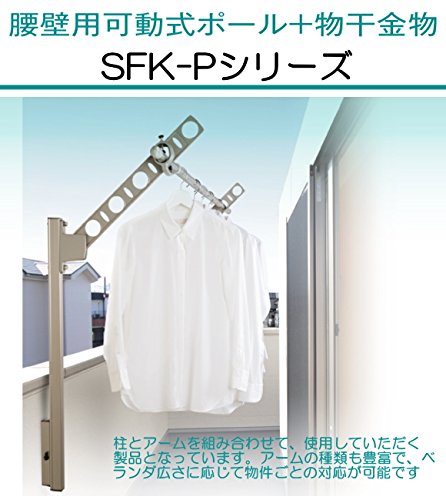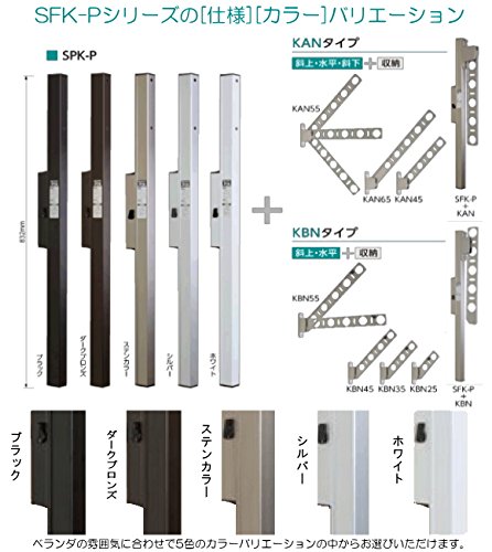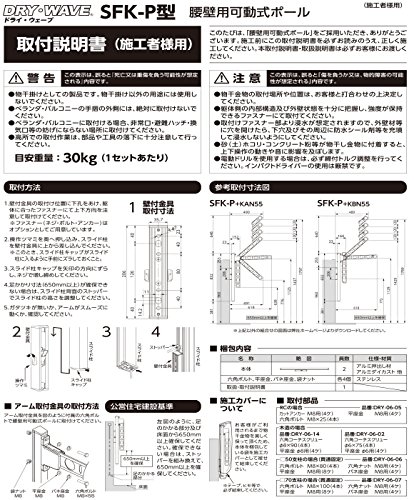 腰壁用可動式ポール+物干金物(DRY・WAVE) ドライ・ウェーブSFK-P+KAN45 (1セット2本組) ポール(柱)とアームを組み合わせて使う物干金物です。 SFK-P(柱)は4段階の高さ調整が可能です。取付けやすく機能も豊富! アーム金物KAN45は3段階角度調整と収納の4段階調整可能。 ベランダに物干し台を置くより有効にスペースを利用できます。アルミ製で腐食に強く、 カラーもブラック・ダークブロンズ・シルバー・ステンカラー・ホワイトの5色! 材質アーム:アルミダイキャスト製 スライド柱:アルミ押し出し材 キャップ類:ポリプロピレン樹脂 カラー/ブラック(K)・ダークブロンズ(BKC)・シルバー(S)・ステンカラー(ST)・ホワイト(W) サイズ/アーム長さ 450mm ポールは120mmで4段階スライド調整可能 耐荷重/1セット当たり:30kg ●アームは斜上・水平・斜下の3挽回と、収納です。 ●音止め部品により、強風時や操作時の不快な金属音を大幅軽減した設計 ●手すりやサッシなどに合わせて、5色のカラーバリエーションより選択できます。 ●価格は1セット2本入りの価格です。取付ビス、物干し竿などはついていません。