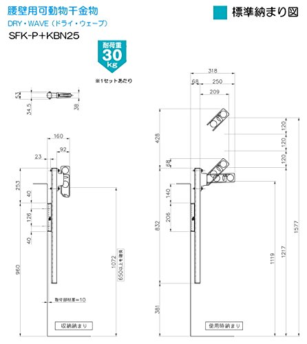 腰壁用可動式ポール+物干金物(DRY・WAVE) ドライ・ウェーブSFK-P+KBN25 (1セット2本組) ポール(柱)とアームを組み合わせて使う物干金物です。SFK-P(柱)は4段階の高さ調整が可能です。取付けやすく機能も豊富! アーム金物 KBN25 は2段階角度調整と垂直収納。ベランダに物干し台を置くより有効にスペースを利用できます。アルミ製で腐食に強く、 カラーもブラック(K)・ダークブロンズ(BKC)・シルバー(S)・ステンカラー(ST)・ホワイト(W)の5色! 材質/アーム:アルミダイキャスト製 スライド柱:アルミ押し出し材 キャップ類:ポリプロピレン樹脂 カラー/ブラック(K)・ダークブロンズ(BKC)・シルバー(S)・ステンカラー(ST)・ホワイト(W) サイズ/アーム長さ 250mm ポールは120mmで4段階スライド調整可能 耐荷重/1セット当たり:30kg ●アームは斜上にと、垂直収納が可能です。 ●音止め部品により、強風時や操作時の不快な金属音を大幅軽減した設計 ●手すりやサッシなどに合わせて、5色のカラーバリエーションより選択できます。 ●価格は1セット2本入りの価格です。取付ビス、物干し竿などはついていません。