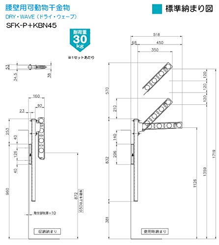 腰壁用可動式ポール+物干金物(DRY・WAVE) ドライ・ウェーブSFK-P+KBN45 (1セット2本組) ポール(柱)とアームを組み合わせて使う物干金物です。SFK-P(柱)は4段階の高さ調整が可能です。取付けやすく機能も豊富! アーム金物KBN45は2段階角度調整と垂直収納。ベランダに物干し台を置くより有効にスペースを利用できます。アルミ製で腐食に強く、 カラーもブラック(K)・ダークブロンズ(BKC)・シルバー(S)・ステンカラー(ST)・ホワイト(W)の5色! 材質/アーム:アルミダイキャスト製 スライド柱:アルミ押し出し材 キャップ類:ポリプロピレン樹脂 カラー/ブラック(K)・ダークブロンズ(BKC)・シルバー(S)・ステンカラー(ST)・ホワイト(W) サイズ/アーム長さ 450mm ポールは120mmで4段階スライド調整可能 耐荷重/1セット当たり:30kg ●アームは斜上にと、垂直収納が可能です。 ●音止め部品により、強風時や操作時の不快な金属音を大幅軽減した設計 ●手すりやサッシなどに合わせて、5色のカラーバリエーションより選択できます。 ●価格は1セット2本入りの価格です。取付ビス、物干し竿などはついていません。