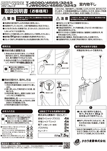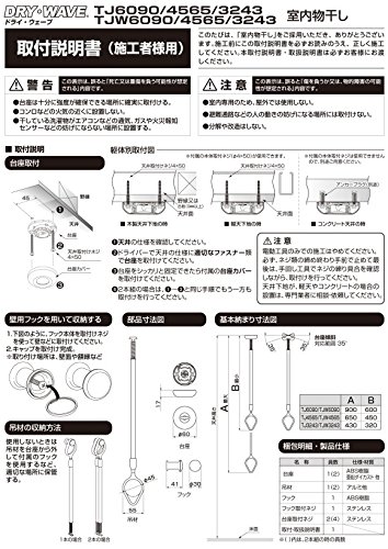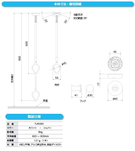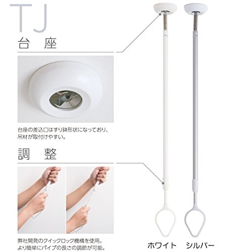 天井から吊り下げて使用する室内物干し。使わない時は台座だけのスッキリ吊下げ型室内物干し。簡単操作で伸縮可能なTJシリーズ。 吊下型室内物干金物 タカラ産業 DRY・WAVE(ドライ・ウェーブ) TJ6090 【1本組販売】 ベース傾斜35度まで対応可能。伸縮幅 600mm~900mm。ポール着脱可能。 カラー/ホワイト・シルバー 耐荷重/8kg 竿伸縮幅/600~900mm 材質/ABS、PP等、アルミ押出形材、亜鉛ダイカスト 特徴 ●ベース傾斜の対応範囲は35度。 ●ポールは、600~900mmの範囲で伸縮ができます。 ●参考ですが、175cmの高さに物干し竿が設置される場合の 天井高さは約230cmから約260cmまで対応可能です。 ●荷重8kg(脱水後のYシャツ約30枚分の重さ)まで吊り下げられます。 ●使わないときはポールをはずしてベースだけですっきりします。 ●はずしたポールセットは壁用フックにかけて収納できます。 ●付属ビスは4x50木造下地用ビスです。 本州、四国、九州地区の内陸は送料無料ですが北海道、沖縄県、その他都府県離島は送料500円(税別)追加となります。