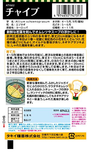 チャイブは、葉ネギのように使えるハーブ品種です。 スープやオムレツ、サラダやシチューなどに利用できます。 ネギやアサツキよりしゃれた風味を持っています。 マイルドな感じの風味になるおすすめのハーブ品種です。 欧州北部原産のユリ科の多年草。 和名ではエゾネギと呼ばれる。 ○種まきは4~5月、9~10月頃にする。 写真とは異なりますが、今期はサカタのタネのチャイブになります。