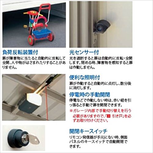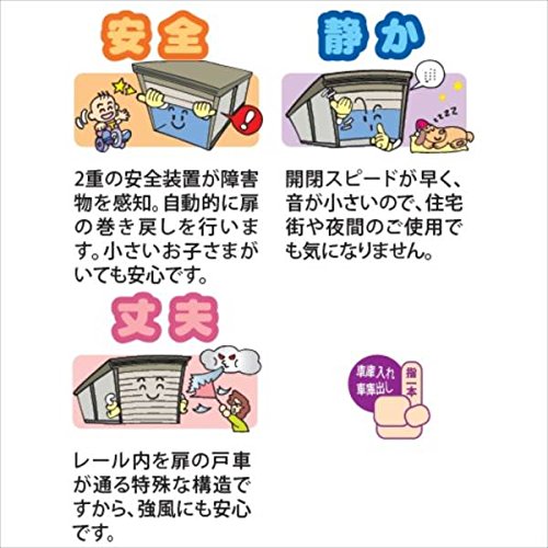 ●●2重の安全装置が障害物を感知。自動的に扉の巻き戻しを行います。小さいお子様がいても安心です。●開閉スピードが早く、音が小さいので、住宅街や夜間のご使用でも気になりません。●レール内を扉の戸車が通る特殊な構造ですから、強風にも安心です。