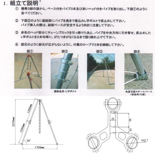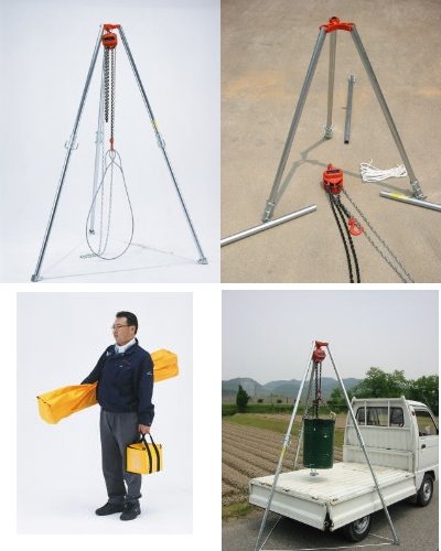 クレーン車がなくても、重量物の吊り作業 が簡単に出来ます。 地震・事故等の災害時緊急救助・墓石等の 移動・樹木の抜根などにも大変便利です。 一人で組立・移動・作業が出来ます。 組立て時間3分程度です。 工具は一切不要です。 仕様 許容荷重 1ton 3脚均等荷重・脚の接地角70度の時 全長 2.5m 1本1.25m×2本連結時(収納時1.35m) 自重 25kg 備考 携帯収納バッグ入り・脚部締結クレモナロープ6.5m付属