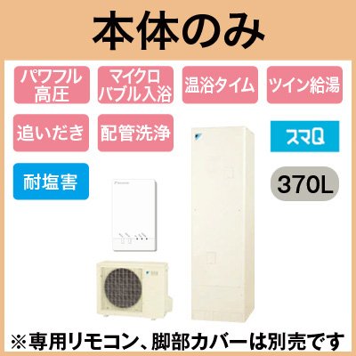 【本体のみ】 ダイキン エコキュート 耐塩害仕様 スマQシリーズ フルオートタイプ 角型 パワフル高圧 370L SEQ37TFVEタッチで給湯、「スマQ」なら操作がもっとカンタン便利。角型 370L (3~5人)※本体のみ、運転には別途リモコンが必要です。●ふろ予約(入/切設定、予約時刻変更)●リアルタイム電力表示●快適な入浴をサポートする「温浴タイム」●「マイクロバブル入浴」対応(※別売のマイクロバブルアダプター KWA083A41が必要です)●パワフル高圧 320kPa●ツイン給湯ふろ自動自動保温・自動たし湯エコふろ保温追いだき高温たし湯自動ふろ配管洗浄貯湯ユニット寸法:高さ1825×幅630×奥行き730mmヒートポンプユニット寸法:高さ635×幅825(+74)×奥行き300mm給湯器用無線LAN接続アダプター:BRP077A41 付※スタイリッシュリモコン(BRC083A1)、脚部化粧カバー(KKC022B4)は別売です