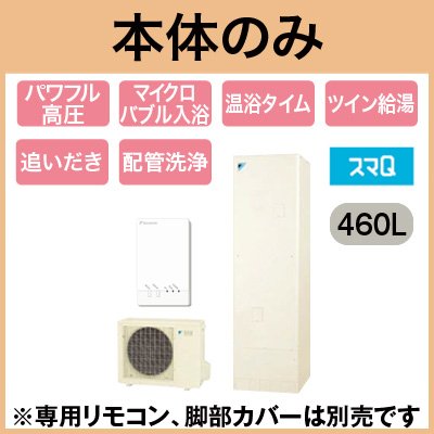 【本体のみ】 ダイキン エコキュート スマQシリーズ フルオートタイプ 角型 パワフル高圧 460L SEQ46TFVタッチで給湯、「スマQ」なら操作がもっとカンタン便利。角型 460L (4~7人)※本体のみ、運転には別途リモコンが必要です。●ふろ予約(入/切設定、予約時刻変更)●リアルタイム電力表示●快適な入浴をサポートする「温浴タイム」●「マイクロバブル入浴」対応(※別売のマイクロバブルアダプター KWA083A41が必要です)●パワフル高圧 320kPa●ツイン給湯ふろ自動自動保温・自動たし湯エコふろ保温追いだき高温たし湯自動ふろ配管洗浄貯湯ユニット寸法:高さ2175×幅630×奥行き730mmヒートポンプユニット寸法:高さ635×幅825(+74)×奥行き300mm給湯器用無線LAN接続アダプター:BRP077A41 付※スタイリッシュリモコン(BRC083A1)、脚部化粧カバー(KKC022B4)は別売です