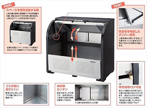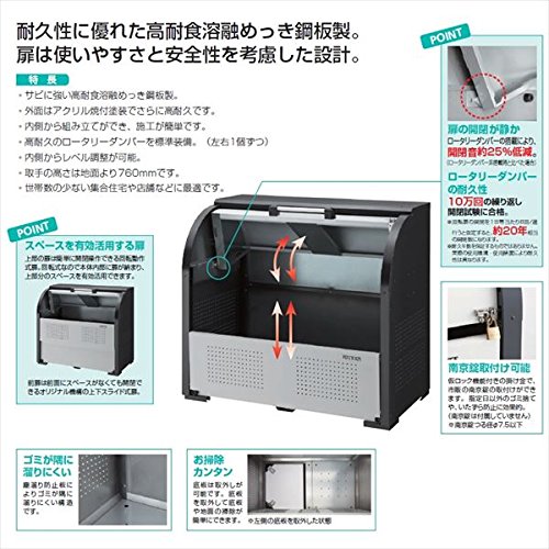 ●組み立てが簡単です。● 高耐食溶融めっき鋼板(ZAM?)に塗装仕上げです。塗装色はオータムグレーです。● 前扉が前倒し式なのでゴミの搬出が容易です。また、積雪時でも開閉可能です。● 上部折戸は風にあおられにくい構造です。● 世帯数の少ない集合住宅や店舗などに最適です。